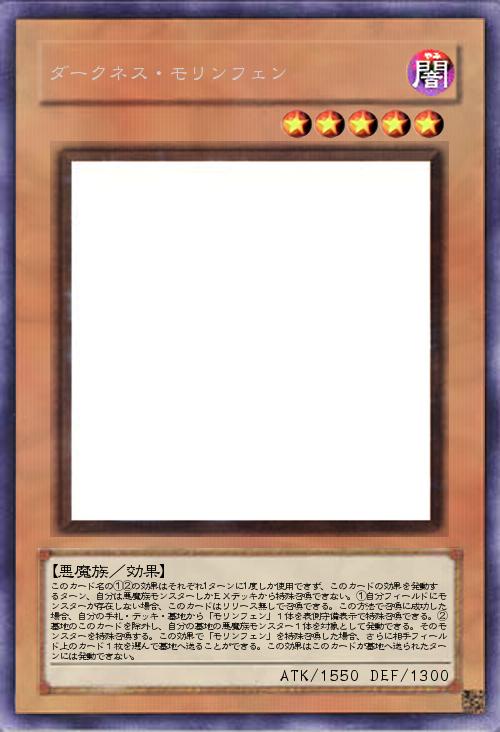 | このカード名の①②の効果はそれぞれ1ターンに1度しか使用できず、このカードの効果を発動するターン、自分は悪魔族モンスターしかEXデッキから特殊召喚できない。①自分フィールドにモンスターが存在しない場合、このカードはリリース無しで召喚できる。この方法で召喚に成功した場合、自分の手札・デッキ・墓地から「モリンフェン」1体を表側守備表示で特殊召喚できる。②墓地のこのカードを除外し、自分の墓地の悪魔族モンスター1体を対象として発動できる。そのモンスターを特殊召喚する。この効果で「モリンフェン」を特殊召喚した場合、さらに相手フィールド上のカード1枚を選んで墓地へ送ることができる。この効果はこのカードが墓地へ送られたターンには発動できない。 | |||