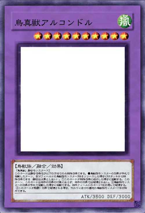 | 「鳥真獣」融合モンスター×2 このカードは融合召喚及び以下の方法でのみ特殊召喚できる。●鳥獣族モンスターの効果が手札で発動したターン、自分フィールドの鳥獣族モンスター3体をリリースした場合にEXデッキから特殊召喚できる(融合は必要としない)。①このカードが特殊召喚に成功した場合に発動する。このターン、このカードは相手の効果の対象にならず、相手の効果では破壊されない。②鳥獣族モンスターの効果が手札で発動した場合に発動できる。相手フィールドのカード1枚を選んで破壊する。 ③このカードが戦闘・効果で破壊される場合、代わりに自分の墓地の鳥獣族モンスター1体を除外できる。 | |||