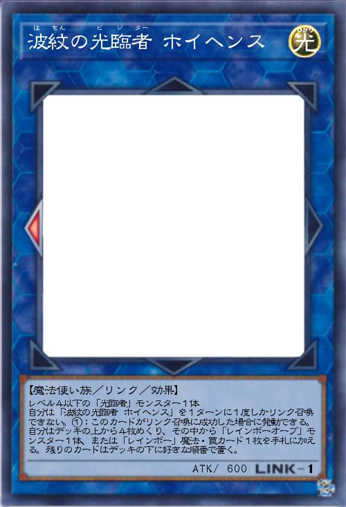 | レベル4以下の「光臨者」モンスター1体 自分は「波紋の光臨者 ホイヘンス」を1ターンに1度しかリンク召喚できない。①:このカードがリンク召喚に成功した場合に発動できる。自分はデッキの上から4枚めくり、その中から「レインボーオーブ」モンスター1体、または「レインボー」魔法・罠カード1枚を手札に加える。残りのカードはデッキの下に好きな順番で置く。 | |||