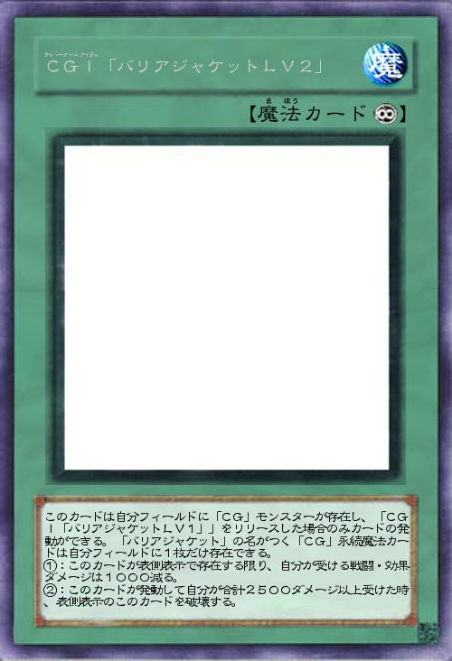 | このカードは自分フィールドに「CG」モンスターが存在し、「CGI「バリアジャケットLV1」」をリリースした場合のみカードの発動ができる。「バリアジャケット」の名がつく「CG」永続魔法カードは自分フィールドに1枚だけ存在できる。 ①:このカードが表側表示で存在する限り、自分が受ける戦闘・効果ダメージは1000減る。 ②:このカードが発動して自分が合計2500ダメージ以上受けた時、表側表示のこのカードを破壊する。 | |||