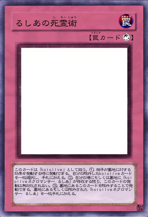 | このカードは「hololive」として扱う。①.相手が墓地に対する効果を発動する時に発動できる。自分の除外したhololiveカードを一枚選択し、手札に加える。②.自分の場にもしくは墓地に「hololiveネクロマンサー るしあ」が存在する限り、このカードの発動は無効化されない。③.墓地にあるこのカードを除外することで発動できる。墓地にあるもしくは除外された「hololiveネクロマンサー るしあ」を一枚手札に加える。 | |||