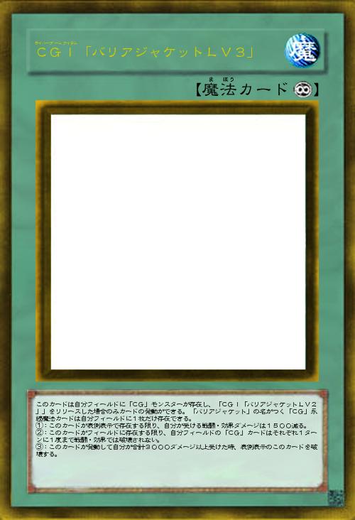 | このカードは自分フィールドに「CG」モンスターが存在し、「CGI「バリアジャケットLV2」」をリリースした場合のみカードの発動ができる。「バリアジャケット」の名がつく「CG」永続魔法カードは自分フィールドに1枚だけ存在できる。 ①:このカードが表側表示で存在する限り、自分が受ける戦闘・効果ダメージは1500減る。 ②:このカードがフィールドに存在する限り、自分フィールドの「CG」カードはそれぞれ1ターンに1度まで戦闘・効果では破壊されない。 ③:このカードが発動して自分が合計3000ダメージ以上受けた時、表側表示のこのカードを破壊する。 | |||