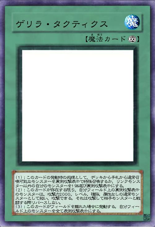 | (1):このカードの発動時の処理として、デッキから手札から通常召喚可能なモンスターを裏側攻撃表示で特殊召喚するか、リンクモンスター以外の自分のモンスターを1体選び裏側攻撃表示にする。 (2):このカードが存在する限り、自分フィールド上の裏側攻撃表示のモンスターは、攻撃力2000、レベル、種族、属性なしの通常モンスターとして扱い、攻撃できる。それは攻撃して相手モンスターと戦闘する際リバースしない。 (3):このカードがフィールドを離れた場合に発動する。自分フィールド上のモンスターを全て表側攻撃表示にする。 | |||