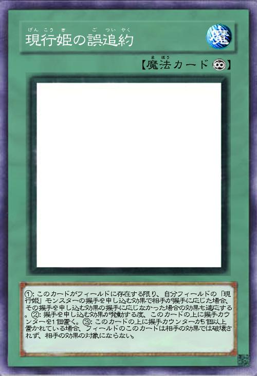 | ①:このカードがフィールドに存在する限り、自分フィールドの「現行姫」モンスターの握手を申し込む効果で相手が握手に応じた場合、その握手を申し込む効果の握手に応じなかった場合の効果も適応する。②:握手を申し込む効果が発動する度、このカードの上に握手カウンターを1個置く。③:このカードの上に握手カウンターが5個以上置かれている場合、フィールドのこのカードは相手の効果では破壊されず、相手の効果の対象にならない。 | |||