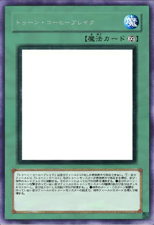 | 「トゥーン・コーヒーブレイク」は自分フィールドに1枚しか表側表示で存在できない。①:自分フィールドに「トゥーン・ワールド」及びトゥーンモンスターが表側表示で存在する場合、自分・相手のエンドフェイズに発動する。そのターンによって以下の効果を適用する。●自分のターン:このターン攻撃を行っていない自分フィールドのトゥーンモンスターの種類の数だけ自分はデッキからドローし、自分はドローした枚数×500LP回復する。。●相手のターン:このターン戦闘を行っていない自分フィールドのトゥーンモンスターの数まで、相手フィールドのカードを選んで破壊する。 | |||