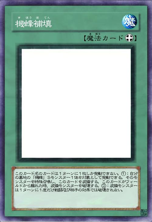 | このカード名のカードは1ターンに1枚しか発動できない。①:自分の墓地の「機蜂」Sモンスター1体を対象として発動できる。そのモンスターを特殊召喚し、このカードを装備する。このカードがフィールドから離れた時、装備モンスターを破壊する。②:装備モンスターは1ターンに1度だけ戦闘及び相手の効果では破壊されない。 | |||