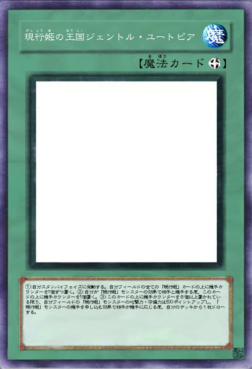| ①:自分スタンバイフェイズに発動する。自分フィールドの全ての「現行姫」カードの上に握手カウンターを1個ずつ置く。②:自分が「現行姫」モンスターの効果で相手と握手する度、このカードの上に握手カウンターを1個置く。③:このカードの上に握手カウンターを5個以上置かれている限り、自分フィールドの「現行姫」モンスターの攻撃力・守備力は500ポイントアップし、「現行姫」モンスターの握手を申し込む効果で相手が握手に応じる度、自分のデッキから1枚ドローする。 | |||