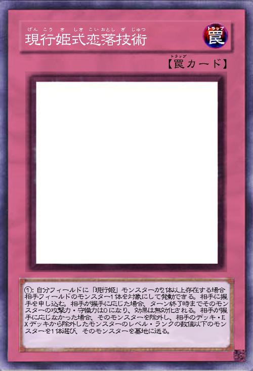 | ①:自分フィールドに「現行姫」モンスターが2体以上存在する場合相手フィールドのモンスター1体を対象にして発動できる。相手に握手を申し込む。相手が握手に応じた場合、ターン終了時までそのモンスターの攻撃力・守備力は0になり、効果は無効化される。相手が握手に応じなかった場合、そのモンスターを除外し、相手のデッキ・EXデッキから除外したモンスターのレベル・ランクの数値以下のモンスターを1体選び、そのモンスターを墓地に送る。 | |||