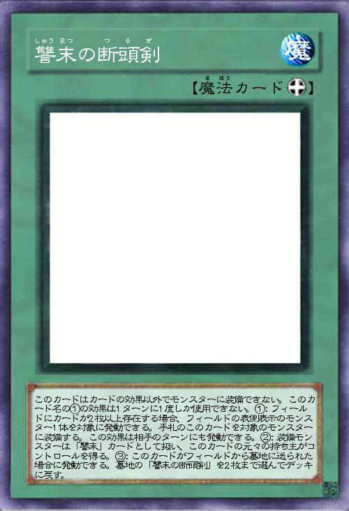 | このカードはカードの効果以外でモンスターに装備できない。このカード名の①の効果は1ターンに1度しか使用できない。①:フィールドにカードが2枚以上存在する場合、フィールドの表側表示のモンスター1体を対象に発動できる。手札のこのカードを対象のモンスターに装備する。この効果は相手のターンにも発動できる。②:装備モンスターは「讐末」カードとして扱い、このカードの元々の持ち主がコントロールを得る。③:このカードがフィールドから墓地に送られた場合に発動できる。墓地の「讐末の断頭剣」を2枚まで選んでデッキに戻す。 | |||