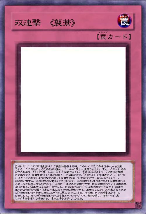 | 自分モンスタ-ゾ-ンに「双連衆」モンスタ-が偶数体存在する時、このカ-ドの①の効果は手札から発動できる。この方法による①の効果発動は、デュエル中1度しか使用できない。また、このカ-ド名の以下の効果は、1タ-ンに1度、いずれかしか発動できない。①自分メインモンスタ-ゾ-ンに表側攻撃表示で存在する「双連衆」モンスタ-1体を対象として発動できる。そのモンスタ-を守備表示にし、自分のデッキからそのモンスタ-より攻撃力の低い「双連衆」モンスタ-を2体まで選び、自分メインモンスタ-ゾ-ンに特殊召喚する。この効果の発動後タ-ン終了時まで、この効果で特殊召喚された「双連衆」モンスタ-と同じ縦列に存在する相手フィ-ルド上のカ-ドは効果を発動できず、既に発動されている効果は無効化される。②墓地にこのカ-ドが存在し、自分メインモンスタ-ゾ-ンに表側表示で存在する「双連衆」モンスタ-が相手の | |||