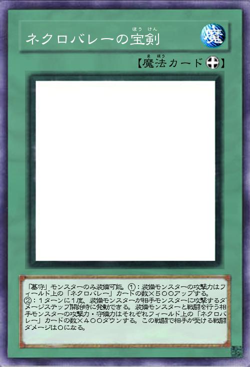 | 「墓守」モンスターのみ装備可能。①:装備モンスターの攻撃力はフィールド上の「ネクロバレー」カードの数×500アップする。 ②:1ターンに1度、装備モンスターが相手モンスターに攻撃するダメージステップ開始時に発動できる。装備モンスターと戦闘を行う相手モンスターの攻撃力・守備力はそれぞれフィールド上の「ネクロバレー」カードの数×400ダウンする。この戦闘で相手が受ける戦闘ダメージは0になる。 | |||