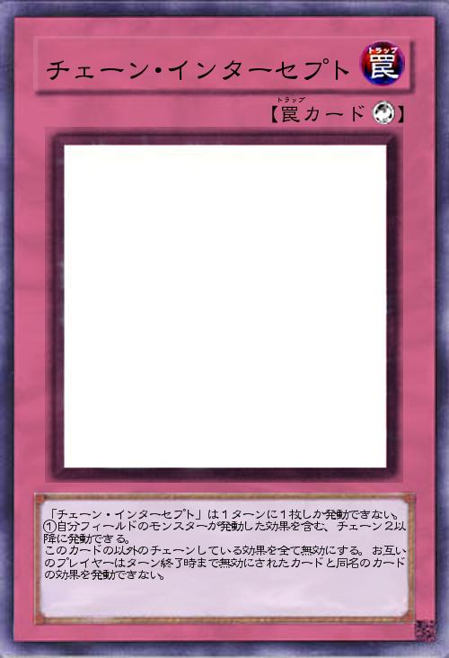 | 「チェーン・インターセプト」は1ターンに1枚しか発動できない。 ①自分フィールドのモンスターが発動した効果を含む、チェーン2以降に発動できる。 このカードの以外のチェーンしている効果を全て無効にする。お互いのプレイヤーはターン終了時まで無効にされたカードと同名のカードの効果を発動できない。 | |||