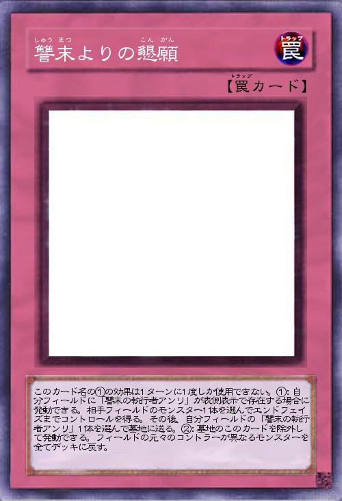 | このカード名の①の効果は1ターンに1度しか使用できない。①:自分フィールドに「讐末の執行者アンリ」が表側表示で存在する場合に発動できる。相手フィールドのモンスター1体を選んでエンドフェイズまでコントロールを得る。その後、自分フィールドの「讐末の執行者アンリ」1体を選んで墓地に送る。②:墓地のこのカードを除外して発動できる。フィールドの元々のコントラーが異なるモンスターを全てデッキに戻す。 | |||