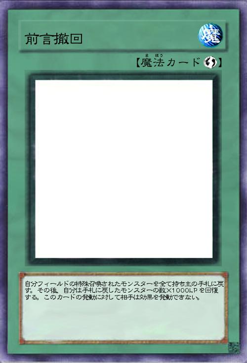 | 自分フィールドの特殊召喚されたモンスターを全て持ち主の手札に戻す。その後、自分は手札に戻したモンスターの数×1000LPを回復する。このカードの発動に対して相手は効果を発動できない。 | |||