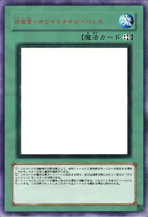 | ①:このカードの発動時の効果処理として、相手フィールドに表側表示モンスターが存在する場合、そのモンスターを全て裏側守備表示にする。 ②:このカードが魔法&罠カードゾーンに存在する限り、自分は通常召喚に加えて1度だけ「ホワイトナイツ」モンスターを召喚できる。 ③:フィールドのこのカードが墓地へ送られた場合に発動できる。このカードを自分フィールドにセットする。この効果でセットしたこのカードはフィールドを離れる場合に除外される。 | |||