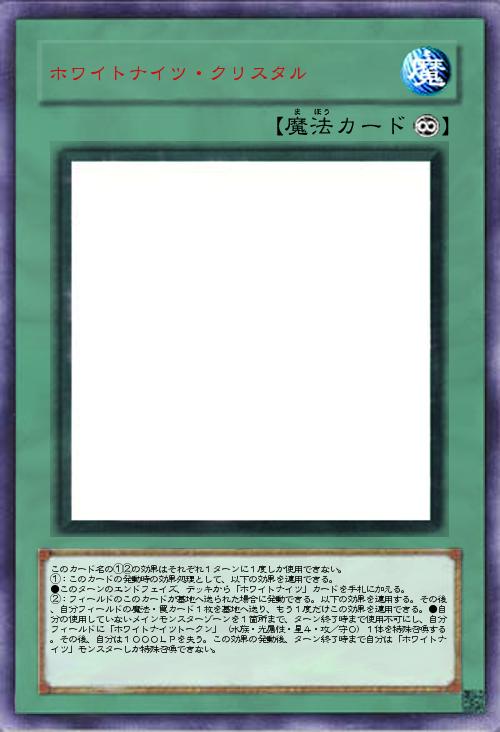 | このカード名の①②の効果はそれぞれ1ターンに1度しか使用できない。 ①:このカードの発動時の効果処理として、以下の効果を適用できる。 ●このターンのエンドフェイズ、デッキから「ホワイトナイツ」カードを手札に加える。 ②:フィールドのこのカードが墓地へ送られた場合に発動できる。以下の効果を適用する。その後、自分フィールドの魔法・罠カード1枚を墓地へ送り、もう1度だけこの効果を適用できる。●自分の使用していないメインモンスターゾーンを1箇所まで、ターン終了時まで使用不可にし、自分フィールドに「ホワイトナイツトークン」(水族・光属性・星4・攻/守0)1体を特殊召喚する。その後、自分は1000LPを失う。この効果の発動後、ターン終了時まで自分は「ホワイトナイツ」モンスターしか特殊召喚できない。 | |||