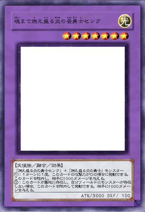 | 「燃え盛る炎の勇士センク」+「燃え盛る炎の勇士」モンスター ①:1ターンに1度、このカードの攻撃力が0の場合に発動できる。このカードを除外し、相手に1000ダメージを与える。 ②:このカードが墓地に存在し、自分フィールドにモンスターが存在しない場合、このカードを除外して発動できる。相手に1000ダメージを与える。 | |||