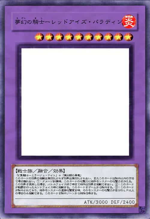 | 「幻影騎士-ミラージュ・ナイト」+「真紅眼の黒竜」 このカードの効果の発動は無効化されず効果は無効化されない、またこのカードは除外以外の方法で場を離れない。①:ダメージ計算時、このカードの攻撃力に相手モンスターの攻撃力を加える。この効果を使用した場合、バトルフェイス終了時まで相手は効果を発動できない。②:このカードが戦闘を行ったエンドフェイス時に発動する。このカードをゲームから除外する。③:このカードが除外されており、相手モンスターの直接攻撃宣言時、そのモンスターの攻撃力が自分のLP以上の場合のみ発動できる。このカードを除外ゾーンから特殊召喚する。 | |||