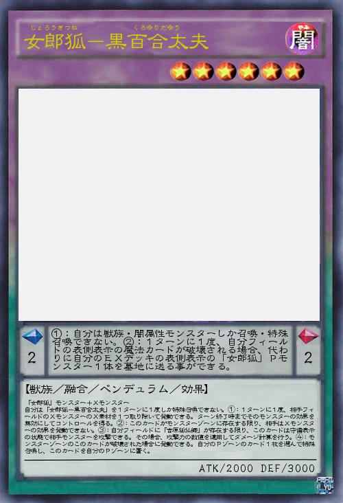 | 「女郎狐」モンスター+Xモンスター 自分は「女郎狐-黒百合太夫」を1ターンに1度しか特殊召喚できない。①:1ターンに1度、相手フィールドのXモンスターのX素材を1つ取り除いて発動できる。ターン終了時までそのモンスターの効果を無効にしてコントロールを得る。②:このカードがモンスターゾーンに存在する限り、相手はXモンスターの効果を発動できない。③:自分フィールドに「吉原狐仙郷」が存在する限り、このカードは守備表示の状態で相手モンスターを攻撃できる。その場合、攻撃力の数値を適用してダメージ計算を行う。④:モンスターゾーンのこのカードが破壊された場合に発動できる。自分のPゾーンのカード1枚を選んで特殊召喚し、このカードを自分のPゾーンに置く。 | |||