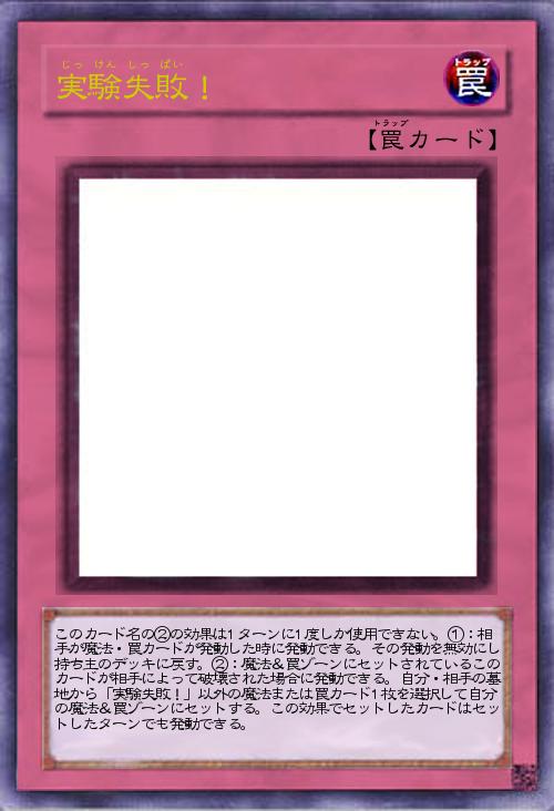 | このカード名の②の効果は1ターンに1度しか使用できない。①:相手が魔法・罠カードが発動した時に発動できる。その発動を無効にし持ち主のデッキに戻す。②:魔法&罠ゾーンにセットされているこのカードが相手によって破壊された場合に発動できる。自分・相手の墓地から「実験失敗!」以外の魔法または罠カード1枚を選択して自分の魔法&罠ゾーンにセットする。この効果でセットしたカードはセットしたターンでも発動できる。 | |||