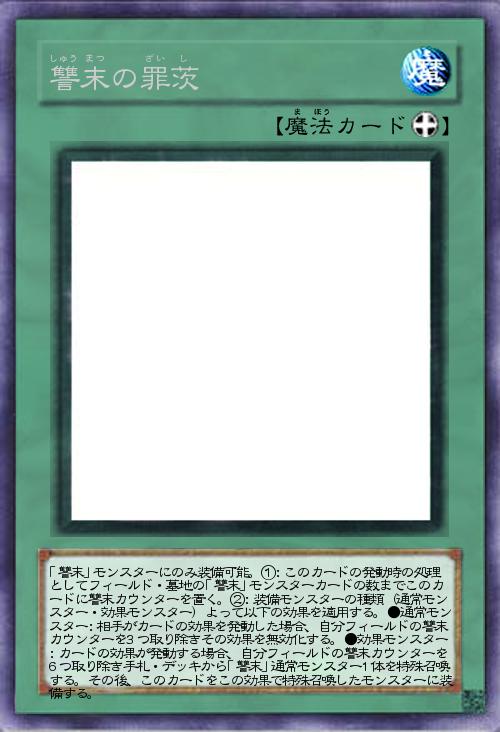 | 「讐末」モンスターにのみ装備可能。①:このカードの発動時の処理としてフィールド・墓地の「讐末」モンスターカードの数までこのカードに讐末カウンターを置く。②:装備モンスターの種類(通常モンスター・効果モンスター)よって以下の効果を適用する。●通常モンスター:相手がカードの効果を発動した場合、自分フィールドの讐末カウンターを3つ取り除きその効果を無効化する。●効果モンスター:カードの効果が発動する場合、自分フィールドの讐末カウンターを6つ取り除き手札・デッキから「讐末」通常モンスター1体を特殊召喚する。その後、このカードをこの効果で特殊召喚したモンスターに装備する。 | |||