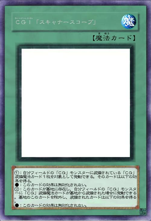 | ①:自分フィールドの「CG」モンスターに装備されている「CG」装備魔法カード1枚を対象として発動できる。そのカードは以下の効果を得る。 ●:このカードの効果は無効化されない。 ②:このカードが墓地に存在し、自分フィールドの「CG」モンスターに「CG」装備魔法カードが墓地から装備された場合に発動できる。墓地のこのカードを除外し、装備されたカードは以下の効果を得る。 ●:このカードの効果は無効化されない。 | |||