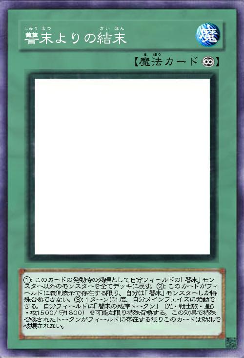 | ①:このカードの発動時の処理として自分フィールドの「讐末」モンスター以外のモンスターを全てデッキに戻す。②:このカードがフィールドに表側表示で存在する限り、自分は「讐末」モンスターしか特殊召喚できない。③:1ターンに1度、自分メインフェイズに発動できる。自分フィールドに「讐末の残滓トークン」(光・戦士族・星6・攻1500/守1800)を可能な限り特殊召喚する。この効果で特殊召喚されたトークンがフィールドに存在する限りこのカードは効果で破壊されない。 | |||