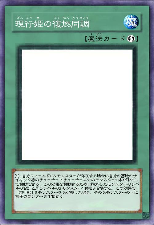 | ①:自分フィールドにSモンスターが存在する場合に自分の墓地のサイキック族のチューナーとチューナー以外のモンスター1体を除外して発動できる。この効果を発動するために除外したモンスターのレベルの合計と同じレベルのSモンスター1体をS召喚する。この効果で「現行姫」SモンスターをS召喚した場合、そのSモンスターの上に握手カウンターを1個置く。 | |||