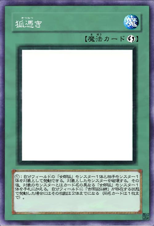 | ①:自分フィールドの「女郎狐」モンスター1体と相手モンスター1体を対象として発動できる。対象としたモンスターを破壊する。その後、対象のモンスターとはカード名の異なる「女郎狐」モンスター1体を手札に加える。自分フィールドに「吉原狐仙郷」が存在する状態で発動した場合にはその枚数は2体までになる(同名カードは1枚まで)。 | |||