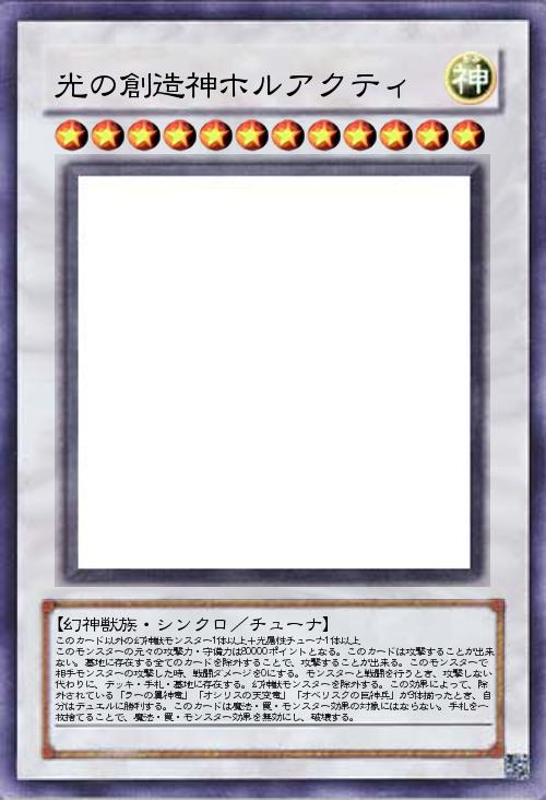 このカード以外の幻神獣モンスター1体以上+光属性チューナ1体以上 このモンスターの元々の攻撃力・守備力は80000ポイントとなる。このカードは攻撃することが出来ない。墓地に存在する全てのカードを除外することで、攻撃することが出来る。このモンスターで相手モンスターの攻撃した時、戦闘ダメージを0にする。モンスターと戦闘を行うとき、攻撃しない代わりに、デッキ・手札・墓地に存在する。幻神獣モンスターを除外する。この効果によって、除外されている「ラーの翼神竜」「オシリスの天空竜」「オベリスクの巨神兵」が3体揃ったとき、自分はデュエルに勝利する。このカードは魔法・罠・モンスター効果の対象にはならない。手札を一枚捨てることで、魔法・罠・モンスター効果を無効にし、破壊する。 |