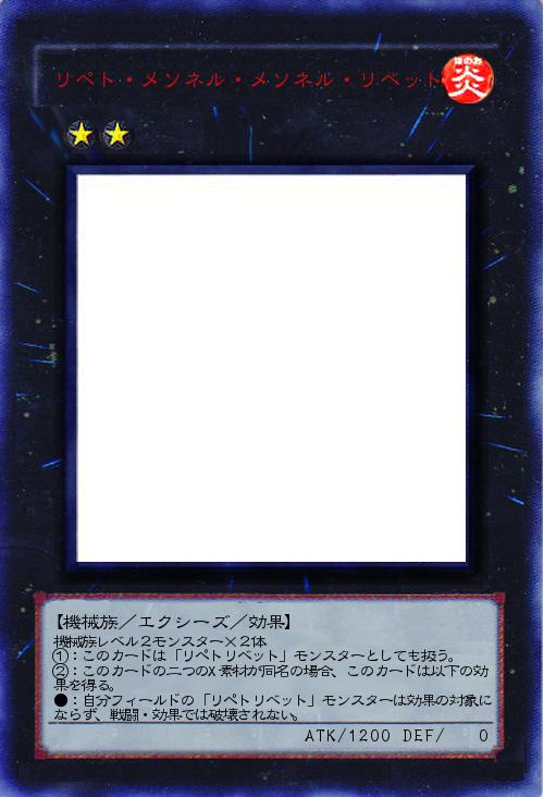 | 機械族レベル2モンスター×2体 ①:このカードは「リペトリベット」モンスターとしても扱う。 ②:このカードの二つのX素材が同名の場合、このカードは以下の効果を得る。 ●:自分フィールドの「リペトリベット」モンスターは効果の対象にならず、戦闘・効果では破壊されない。 | |||