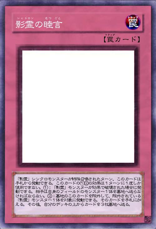 | 「影霊」シンクロモンスターが特殊召喚されたターン、このカードは手札から発動できる。このカードの①②の効果は1ターンに1度しか使用できない。①:「影霊」モンスターが効果で破壊された場合に発動できる。相手は自身のフィールドのモンスター1体を墓地へ送らなければならない。②:墓地のこのカードを除外して、除外されている「影霊」モンスター1体を対象に発動できる。そのカードを手札に加える。その後、自分のデッキの上からカードを3枚墓地へ送る。 | |||