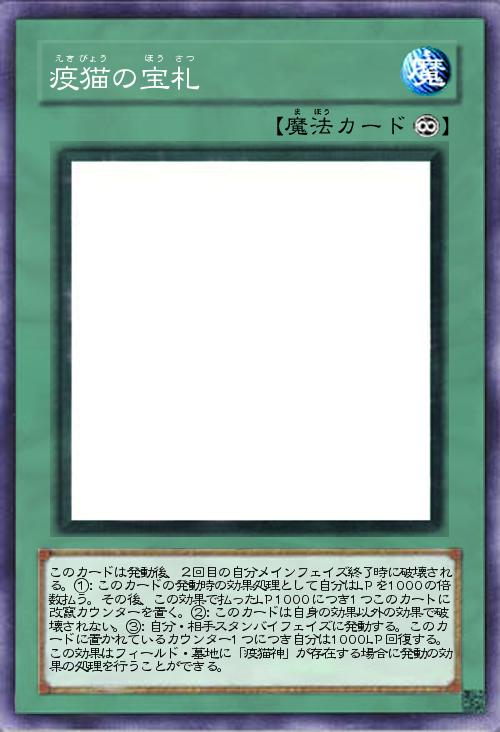 | このカードは発動後、2回目の自分メインフェイズ終了時に破壊される。①:このカードの発動時の効果処理として自分はLPを1000の倍数払う。その後、この効果で払ったLP1000につき1つこのカートに改竄カウンターを置く。②:このカードは自身の効果以外の効果で破壊されない。③:自分・相手スタンバイフェイズに発動する。このカードに置かれているカウンター1つにつき自分は1000LP回復する。この効果はフィールド・墓地に「疫猫神」が存在する場合に発動の効果の処理を行うことができる。 | |||