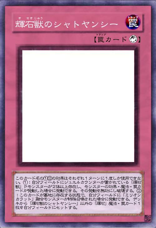 | このカード名の①②の効果はそれぞれ1ターンに1度しか使用できない。①:自分フィールドにジュエルカウンターが置かれている「輝石獣」Pモンスターが2体以上存在し、モンスターの効果・魔法・罠カードが発動した場合に発動できる。その発動を無効にし破壊する。②:このカードが墓地に存在する状態で、自分フィールドに「ミリオンカラット」融合モンスターが特殊召喚された場合に発動できる。デッキから「輝石獣のシャトヤンシー」以外の「輝石」魔法・罠カード1枚を自分フィールドにセットする。 | |||