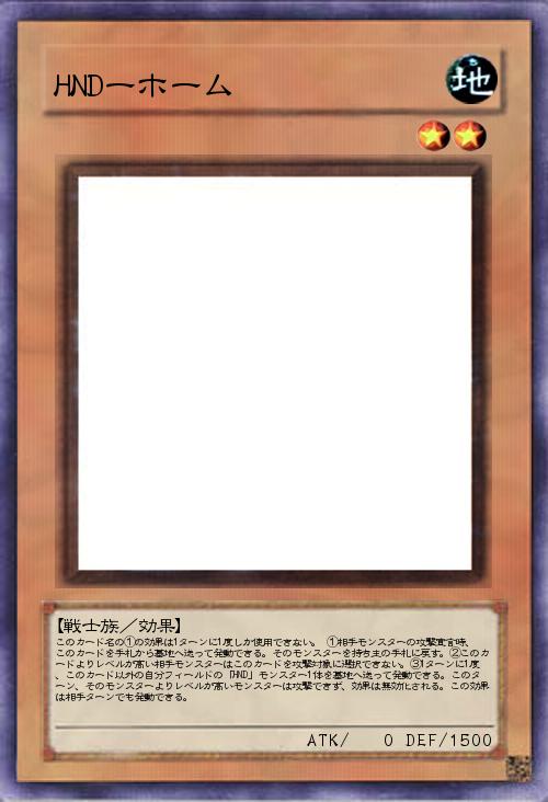 | このカード名の①の効果は1ターンに1度しか使用できない。 ①相手モンスターの攻撃宣言時、このカードを手札から墓地へ送って発動できる。そのモンスターを持ち主の手札に戻す。②このカードよりレベルが高い相手モンスターはこのカードを攻撃対象に選択できない。③1ターンに1度、このカード以外の自分フィールドの「HND」モンスター1体を墓地へ送って発動できる。このターン、そのモンスターよりレベルが高いモンスターは攻撃できず、効果は無効化される。この効果は相手ターンでも発動できる。 | |||