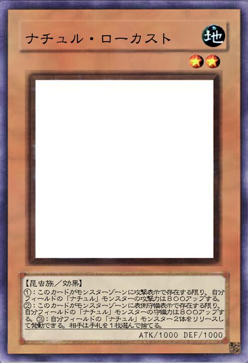 | ①:このカードがモンスターゾーンに攻撃表示で存在する限り、自分フィールドの「ナチュル」モンスターの攻撃力は800アップする。②:このカードがモンスターゾーンに表側守備表示で存在する限り、自分フィールドの「ナチュル」モンスターの守備力は800アップする。③:自分フィールドの「ナチュル」モンスター2体をリリースして発動できる。相手は手札を1枚選んで捨てる。 | |||