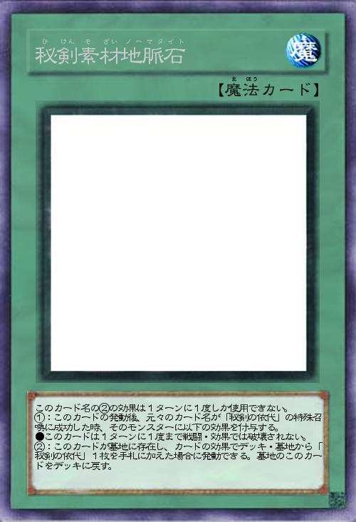 | このカード名の②の効果は1ターンに1度しか使用できない。 ①:このカードの発動後、元々のカード名が「秘剣の依代」の特殊召喚に成功した時、そのモンスターに以下の効果を付与する。 ●このカードは1ターンに1度まで戦闘・効果では破壊されない。 ②:このカードが墓地に存在し、カードの効果でデッキ・墓地から「秘剣の依代」1枚を手札に加えた場合に発動できる。墓地のこのカードをデッキに戻す。 | |||