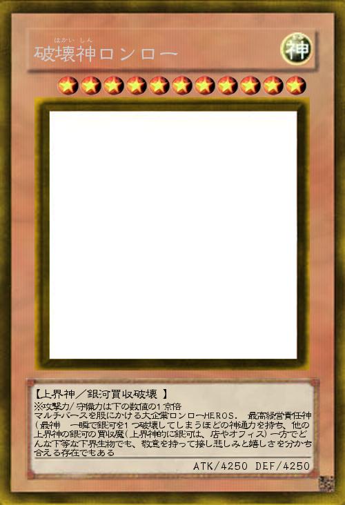 | ※攻撃力/守備力は下の数値の1京倍 マルチバースを股にかける大企業ロンローHEROS. 最高経営責任神(最神) 一瞬で銀河を1つ破壊してしまうほどの神通力を持ち、他の上界神の銀河の買収魔(上界神的に銀河は、店やオフィス)一方でどんな下等な下界生物でも、敬意を持って接し悲しみと嬉しさを分かち合える存在でもある | |||