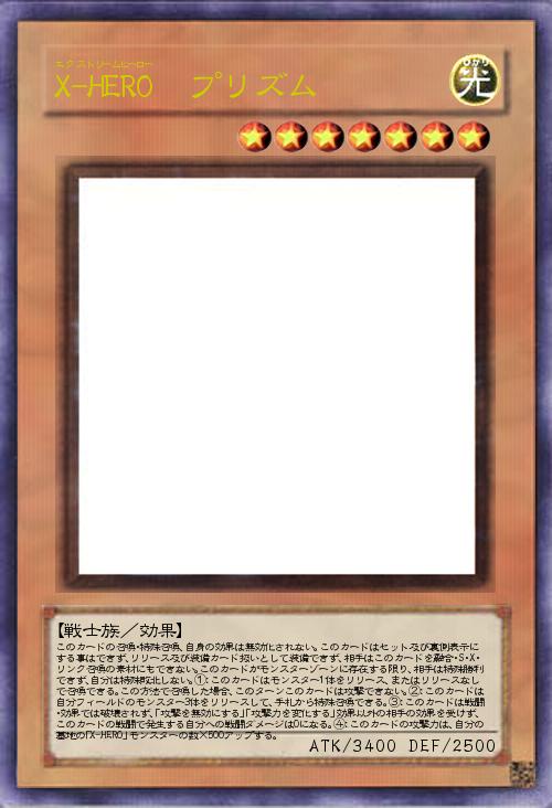| このカードの召喚・特殊召喚、自身の効果は無効化されない。このカードはセット及び裏側表示にする事はできず、リリース及び装備カード扱いとして装備できず、相手はこのカードを融合・S・X・リンク召喚の素材にもできない。このカードがモンスターゾーンに存在する限り、相手は特殊勝利できず、自分は特殊敗北しない。①:このカードはモンスター1体をリリース、またはリリースなしで召喚できる。この方法で召喚した場合、このターンこのカードは攻撃できない。②:このカードは自分フィールドのモンスター3体をリリースして、手札から特殊召喚できる。③:このカードは戦闘・効果では破壊されず、「攻撃を無効にする」「攻撃力を変化する」効果以外の相手の効果を受けず、このカードの戦闘で発生する自分への戦闘ダメージは0になる。④:このカードの攻撃力は、自分の墓地の「X-HERO」モンスターの数×500アップする。 | |||