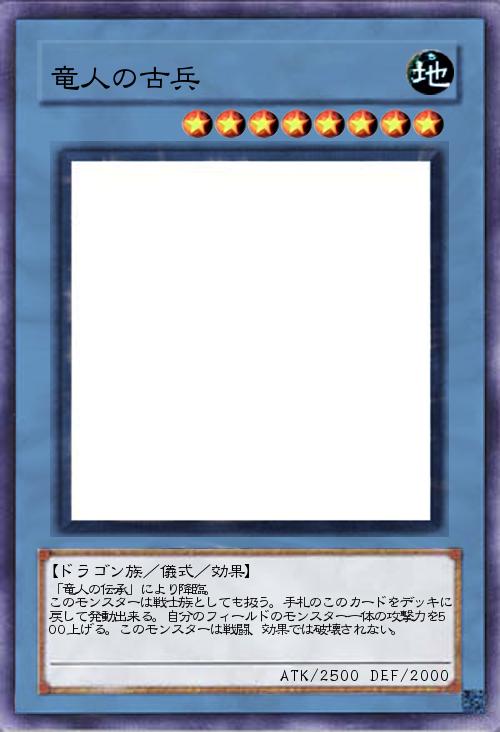 | 「竜人の伝承」により降臨。 このモンスターは戦士族としても扱う。手札のこのカードをデッキに戻して発動出来る。自分のフィールドのモンスター一体の攻撃力を500上げる。このモンスターは戦闘、効果では破壊されない。 | |||