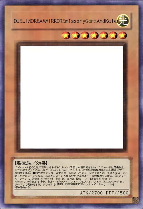 | このカード名の①②の効果はそれぞれ1ターンに1度しか使用できない。このカードは闇属性としても扱う ①:このカードが「Dream Mirror」モンスターの効果で特殊召喚された場合以下の効果を得る。●相手がコントロールするカードによってダメージを受けた時、受けたダメージと同じだけダメージを与え、与えたダメージと同じ分だけこのカードの攻撃力を上げる。②:フィールドゾーンに「Dream Mirror of Teller」または「Duel IN Dream Mirror of chaos 」が存在する場合、自分・相手のメインフェイズ及びバトルフェイズにこのカードをリリースして発動できる。デッキから「DUELINDREAMMIRRORForgottenCaliber」1体を特殊召喚する。 | |||