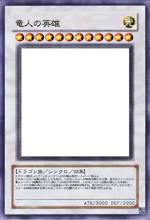 | ドラゴン族Sチューナー+チューナー以外の戦士族モンスター一体以上 このモンスターは戦士族としても扱う。このモンスターが特殊召喚された時、自分のフィールドに竜人トークン(地属性ドラゴン族レベル4攻1000守500、このモンスターは戦士族としても扱い、シンクロ召喚の為にリリース出来ない)を二体特殊召喚する。自分がエクストラデッキからモンスターを特殊召喚する時このモンスターの攻撃力をターン終了時まで500上げる。 | |||