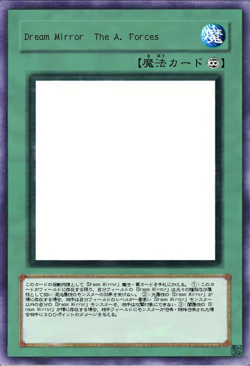 | このカードの発動処理として「Dream Mirror」魔法・罠カードを手札に加える。 ①:このカードがフィールドに存在する限り、自分フィールドの「Dream Mirror」は元々の種族及び属性として扱い 混沌属性のモンスターの効果を受けない。 ②:光属性の「Dream Mirror」が場に存在する場合、相手は自分フィールドのレベルが一番高い「Dream Mirror」モンスター以外の自分の「Dream Mirror」モンスターを、相手は攻撃対象にできない ③:闇属性の「Dream Mirror」が場に存在する場合、相手フィールドにモンスターが召喚・特殊召喚された場合相手に300ポイントのダメージを与える。 | |||