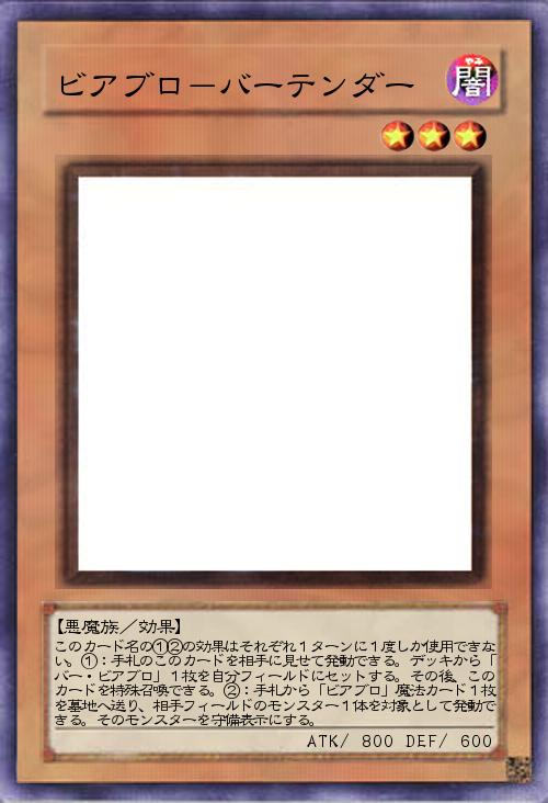 | このカード名の①②の効果はそれぞれ1ターンに1度しか使用できない。①:手札のこのカードを相手に見せて発動できる。デッキから「バー・ビアブロ」1枚を自分フィールドにセットする。その後、このカードを特殊召喚できる。②:手札から「ビアブロ」魔法カード1枚を墓地へ送り、相手フィールドのモンスター1体を対象として発動できる。そのモンスターを守備表示にする。 | |||