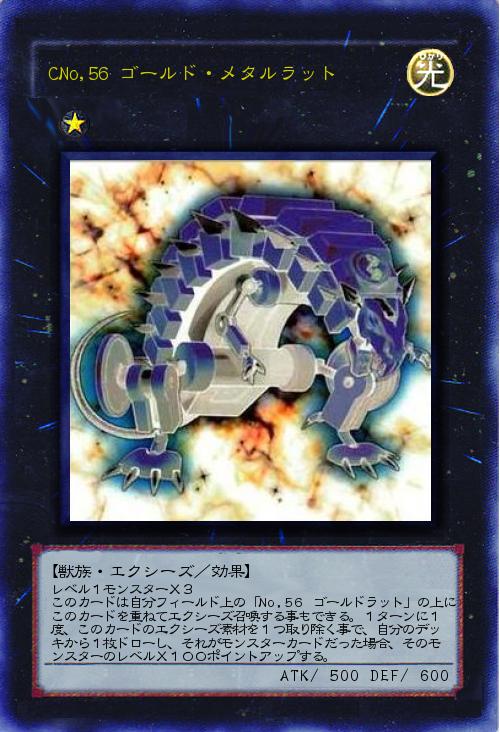 レベル1モンスターX3 このカードは自分フィールド上の「No,56 ゴールドラット」の上にこのカードを重ねてエクシーズ召喚する事もできる。1ターンに1度、このカードのエクシーズ素材を1つ取り除く事で、自分のデッキから1枚ドローし、それがモンスターカードだった場合、そのモンスターのレベルX100ポイントアップする。 |