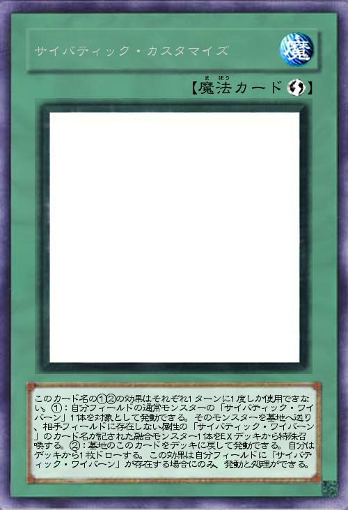 | このカード名の①②の効果はそれぞれ1ターンに1度しか使用できない。①:自分フィールドの通常モンスターの「サイバティック・ワイバーン」1体を対象として発動できる。そのモンスターを墓地へ送り、相手フィールドに存在しない属性の「サイバティック・ワイバーン」のカード名が記された融合モンスター1体をEXデッキから特殊召喚する。②:墓地のこのカードをデッキに戻して発動できる。自分はデッキから1枚ドローする。この効果は自分フィールドに「サイバティック・ワイバーン」が存在する場合にのみ、発動と処理ができる。 | |||