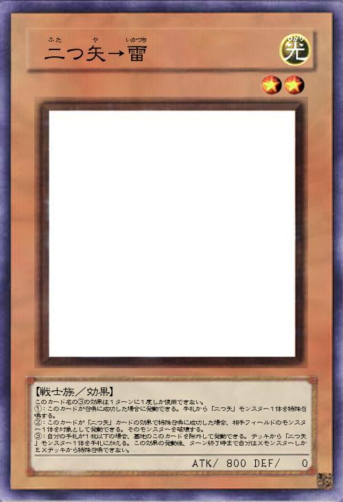 | このカード名の③の効果は1ターンに1度しか使用できない。 ①:このカードが召喚に成功した場合に発動できる。手札から「二つ矢」モンスター1体を特殊召喚する。 ②:このカードが「二つ矢」カードの効果で特殊召喚に成功した場合、相手フィールドのモンスター1体を対象として発動できる。そのモンスターを破壊する。 ③:自分の手札が1枚以下の場合、墓地のこのカードを除外して発動できる。デッキから「二つ矢」モンスター1体を手札に加える。この効果の発動後、ターン終了時まで自分はXモンスターしかEXデッキから特殊召喚できない。 | |||