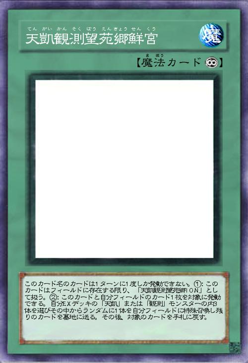 | このカード名のカードは1ターンに1度しか発動できない。①:このカードはフィールドに存在する限り、「天凱観測望苑郷ION」として扱う。②:このカードと自分フィールドのカード1枚を対象に発動できる。自分EXデッキの「天凱」または「観測」モンスターの内3体を選びその中からランダムに1体を自分フィールドに特殊召喚し残りのカードを墓地に送る。その後、対象のカードを手札に戻す。 | |||