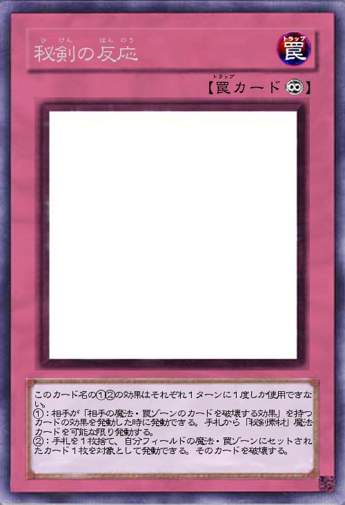 | このカード名の①②の効果はそれぞれ1ターンに1度しか使用できない。 ①:相手が「相手の魔法・罠ゾーンのカードを破壊する効果」を持つカードの効果を発動した時に発動できる。手札から「秘剣素材」魔法カードを可能な限り発動する。 ②:手札を1枚捨て、自分フィールドの魔法・罠ゾーンにセットされたカード1枚を対象として発動できる。そのカードを破壊する。 | |||