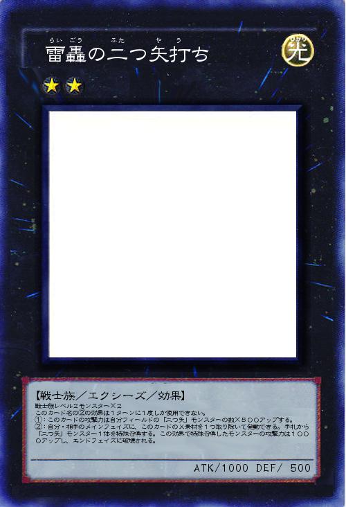 | 戦士族レベル2モンスター×2 このカード名の②の効果は1ターンに1度しか使用できない。 ①:このカードの攻撃力は自分フィールドの「二つ矢」モンスターの数×500アップする。 ②:自分・相手のメインフェイズに、このカードのX素材を1つ取り除いて発動できる。手札から「二つ矢」モンスター1体を特殊召喚する。この効果で特殊召喚したモンスターの攻撃力は1000アップし、エンドフェイズに破壊される。 | |||